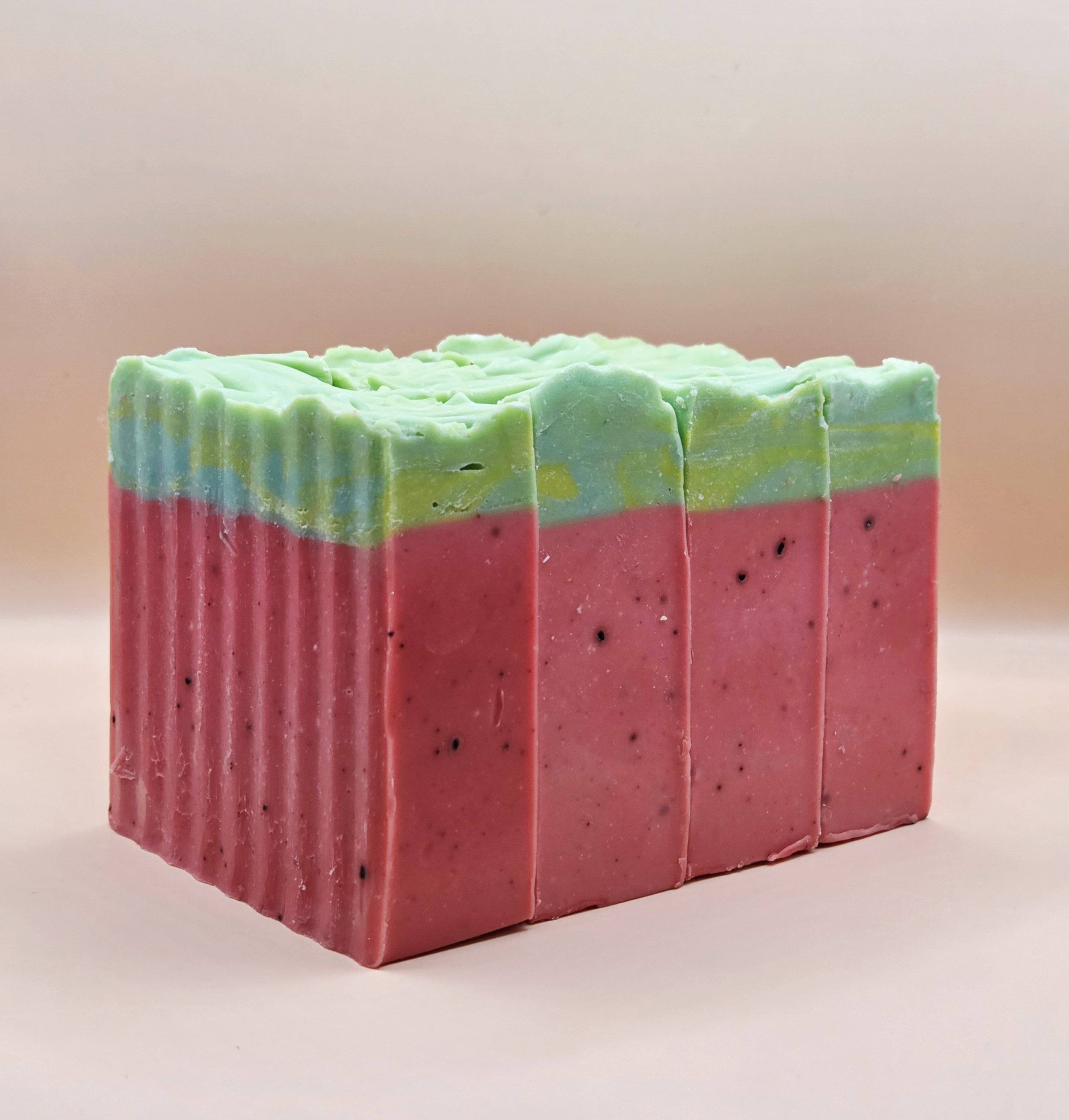 Handcrafted in small batches, this cold processed watermelon soap brings a fresh, summery feel to a rustic farmhouse bath. Juicy watermelon notes are balanced with the earthy texture of real coffee grounds, which provide gentle exfoliation while adding a natural, handcrafted look. Made with nourishing oils, this bar creates a creamy lather that cleanses without stripping the skin. The speckled design and simple, wholesome ingredients give this soap an old-fashioned charm—perfect for farmhouse sinks, gift baskets, or everyday use with a touch of countryside character